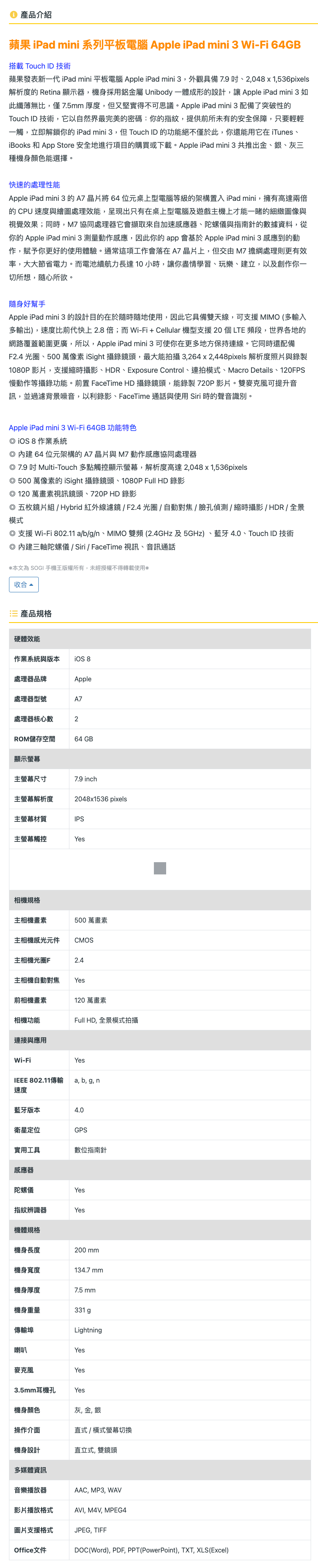【Apple】iPad mini3 64GB (金) 數量減少