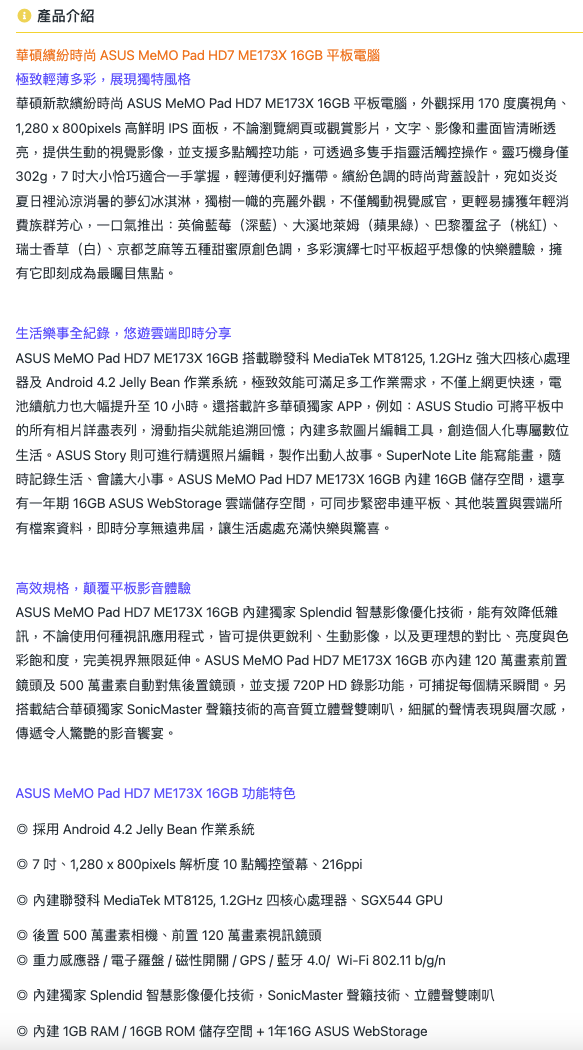 【ASUS】 平板電腦 (ME173X)