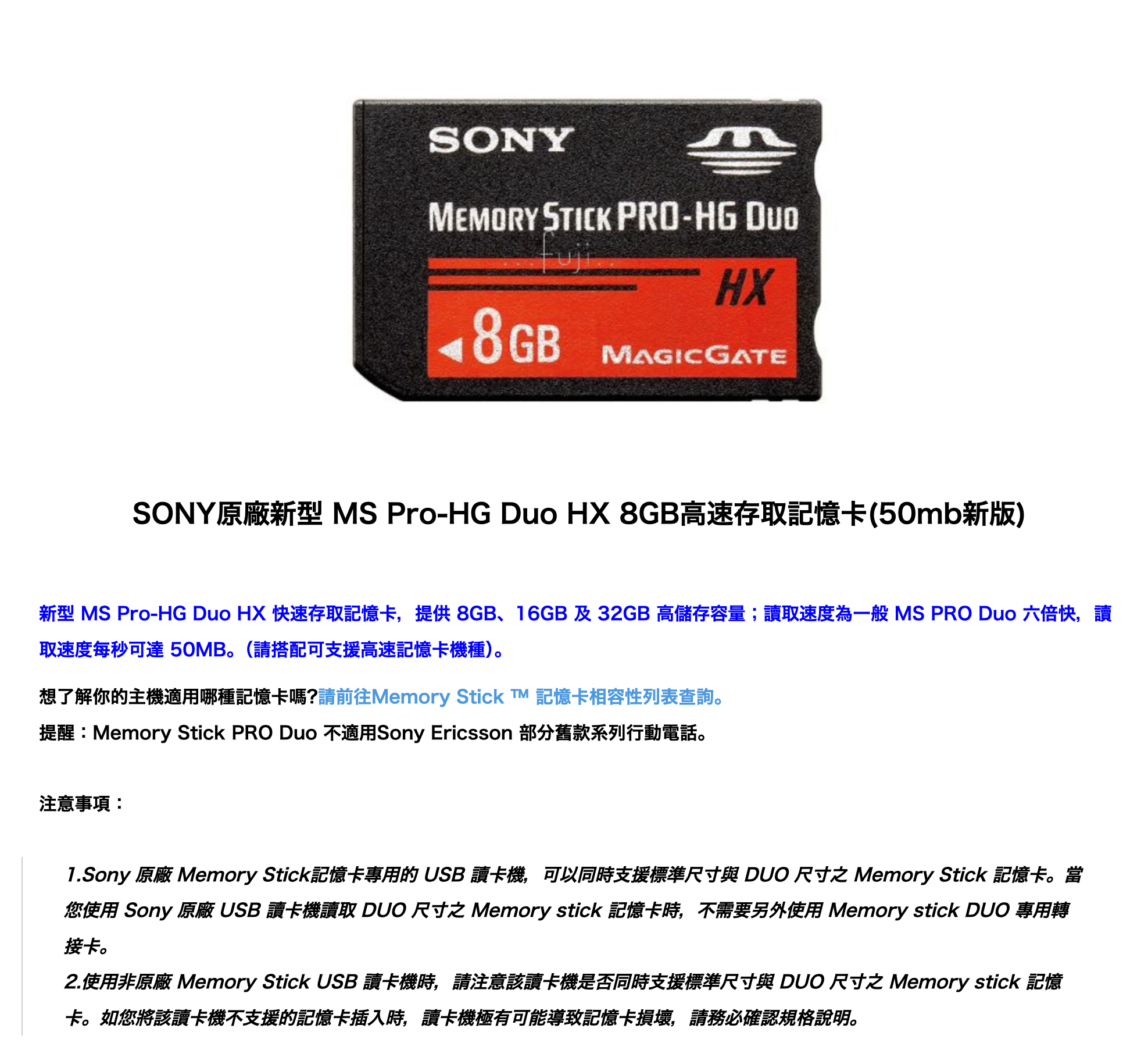 【SONY】記憶卡 HX8G (MS-HX8B) 數量減少